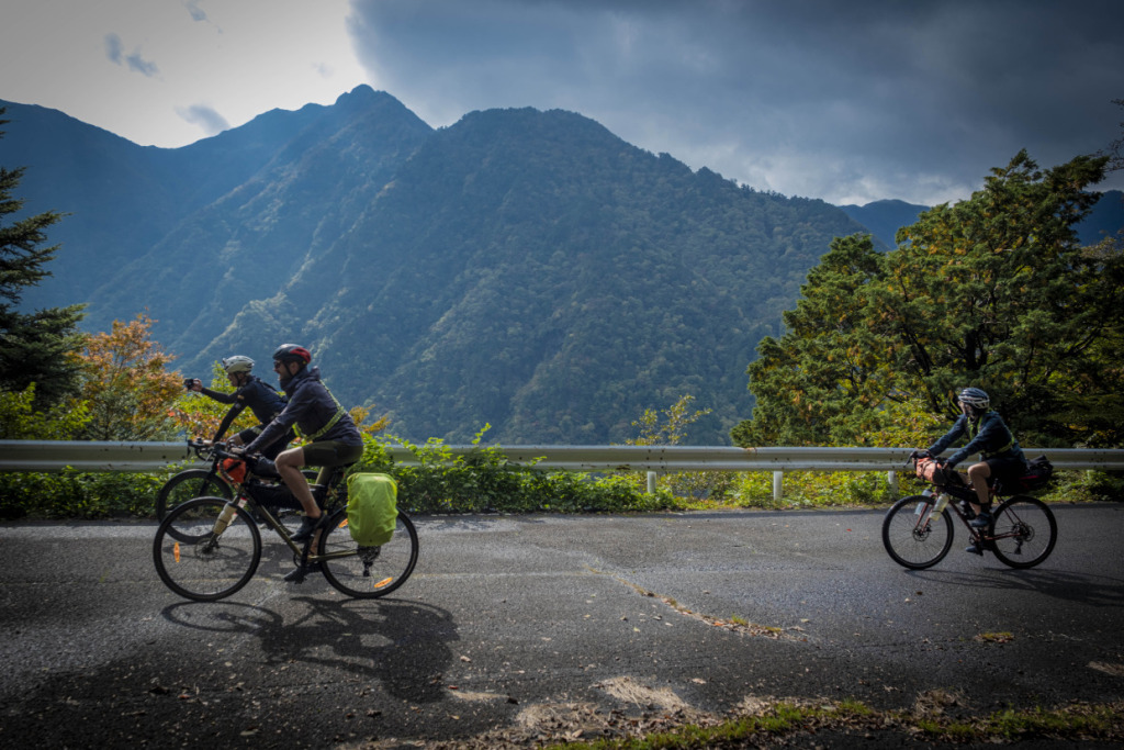 ライド2日目は、愛媛の山へと向かう。目指すは屈指の山岳サイクリングルート、”UFOライン”。西日本最高峰の石槌山系を巡る絶景ルートだ。しかし、海に面した西条市内の海抜ほぼ0mから、一気に1700mの高地へ駆け上がるのだから、気合が入る。朝まで降っていた雨は上がり、雲間から朝日が差してくる。清々しい空気の中、渓谷沿いに徐々に狭まる長い登坂を、脚の合う者同志でパックになって登ってゆく。樹林帯の九十九折の道の、程よい勾配を行けば、背の高い、まっすぐな杉の木立の間をすり抜けた光が、キラキラと遊ぶ。見え隠れする稜線が、朝日を受け輝いている。ロブ、アダム、ピーター、マークの4人と、徒然にサドルトークを交わし、気心も知れてくる。紅葉の斜面を、昨日の雨水を束ねた清冽な滝筋が、谷底へと落ちていく。不意に訪れるシャッターチャンスが悩ましい。皆スマホを構えて行きつ戻りつ、せわしいクライミングを経て、ようやくUFOラインの入口に取り付いた。気づけば標高は1000mを越えていた。コーヒーに特に目がないオージーたちのために、ガイドのサムさんとミホさんが淹れてくれたコーヒーとスイーツが嬉しい。四国山脈に抱かれ、至福の珈琲タイムに和む。