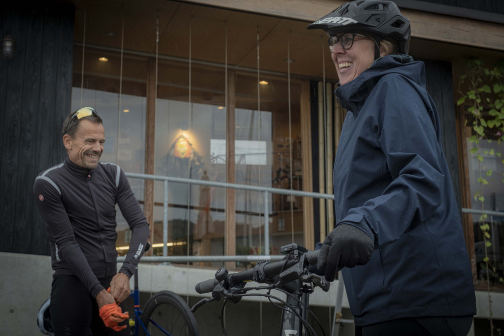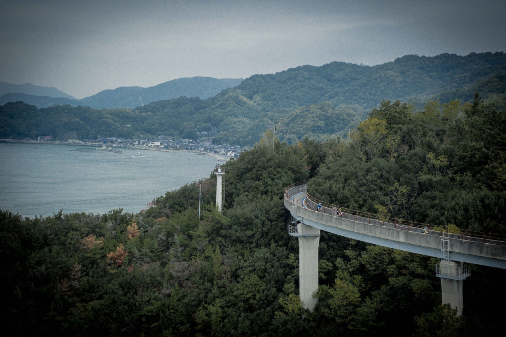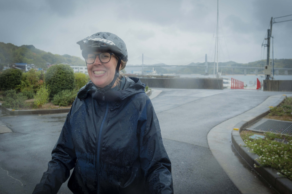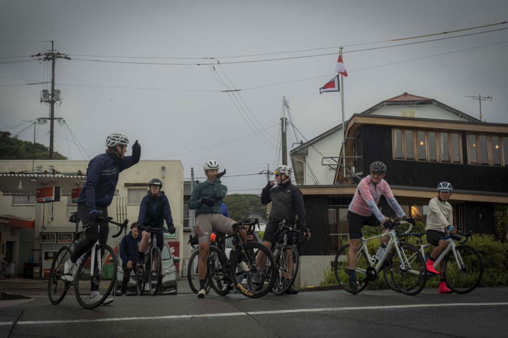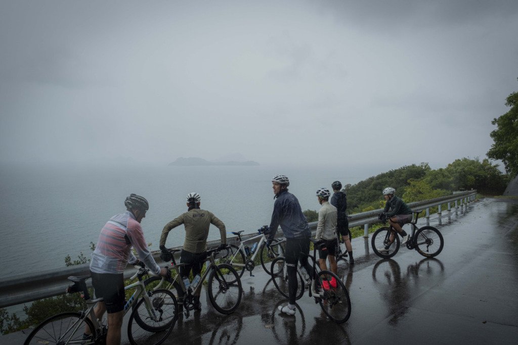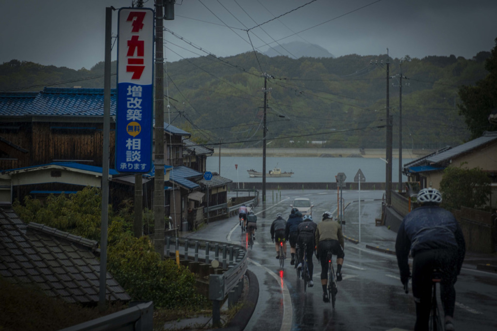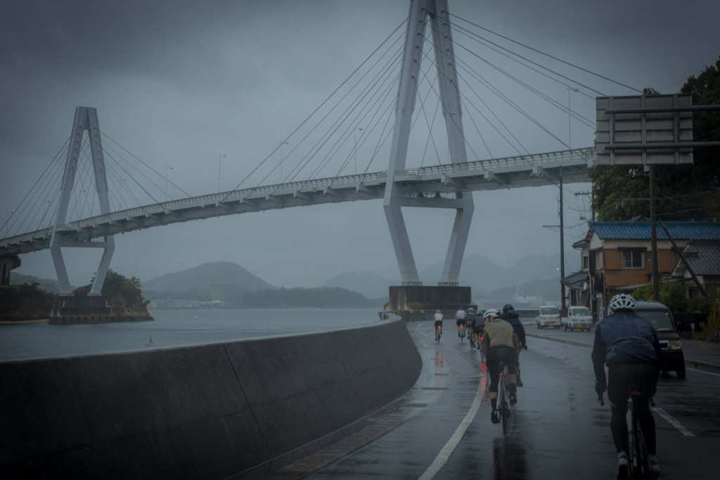 上島町の観光拠点「サイクルオアシス」で、ライトなレイン装備で整えた一行は、さっそくゆめしま街道へと滑り出した。ここまで焦らされた想いをペダルに乗せ、海岸線に水しぶきをあげて、オーストラリアントレインが加速する。日本人なら、瀬戸内の美観は雨などで遜色しないことを知っているが、彼らもそれに気づきつつある。曇天、または雨で湿度の飽和したような大気にこそ、日本的美、旅情は増すものだ。侘び、寂びである。弓削島の海岸線、乳白色のやわらかな背景に島影が流れ過ぎていく。午後のひっそりした漁村の路地を抜け、”ゆめしま”を繋ぐ新しい橋へと駆け上がる。エリアは小さくとも、景色や風土の濃さに変わりはない。踏みきれる60kmほどのコンパクトなルート、パンチの効いたアップダウンに単調さはない。雨も良いが、晴れならばなお…、などと言うまでもないだろう。なにより、びしょ濡れの笑顔が物語っている。”ゆめしま海道”が、しまなみ海道の新しい顔になる予感を、ビシビシと感じるライドとなった。