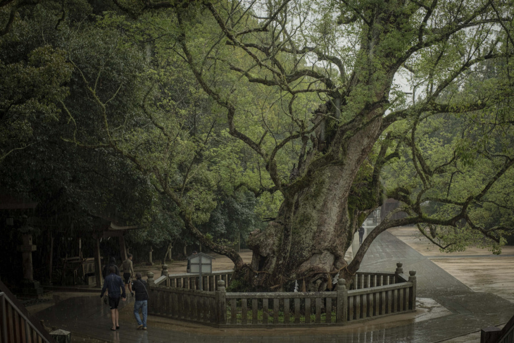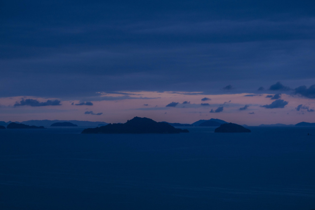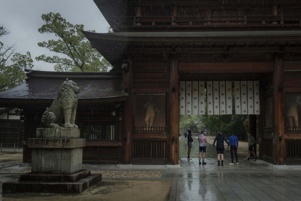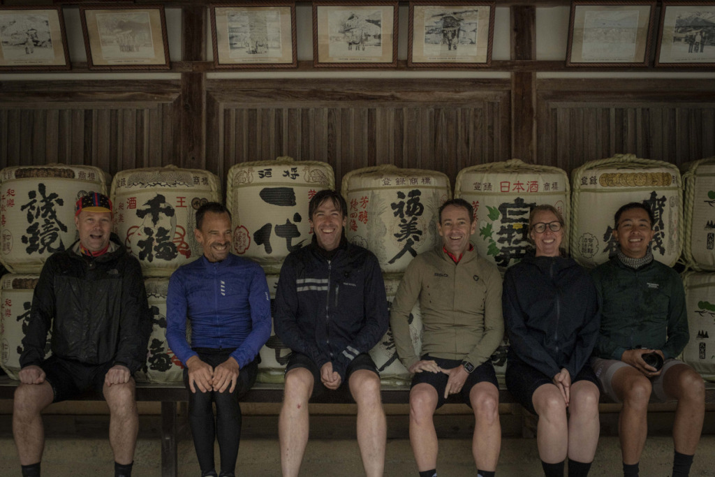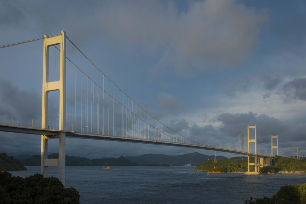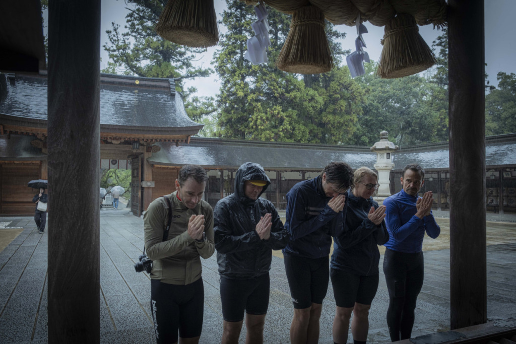愛媛旅のはじまりは、しまなみ海道から、と決まってはいるのだが…、初日は生憎の雨模様。それでも定刻前には、メンバー全員サイクルジャージに正装して集合している。オージーの士気の高さよ。しかし、予報芳しくないので、安全優先、ひとまずルートを車で辿ることに。車中からも熱心にルートを観察し、ガイドの説明に耳を傾けてライドをイメージする様子の面々。不本意な状況でも、車中明るいオージーたち。高台からの眺望を得ようと、しまなみ海道定番のヒルクライムルートで亀老山頂上へ上がった。自然との調和をテーマとする国際的建築家である隈研吾が、若かりし日に設計した展望台からの眺望は、しまなみ海道随一なのだ。雨雲の合間に霞む瀬戸内の島並みも、それはそれでオツなものだ。ついで大三島へ移動し、古へより信仰を集める大山祇神社へ参拝する。樹齢2600年!の楠の巨木をくぐり、本殿を参詣。境内を散策しながら、午後は乗りたいねー、と願う彼らを、天は見ていたのか、昼頃に小降りになってきた。ランチを、瀬戸内の地物海鮮丼で満たし、心身とも燃料満タン、準備万端だ。回復傾向の予報に、多少の雨は織り込んで、ライド敢行と決まった!そうとなれば善は急げで、本日のハイライトルート、”ゆめしま海道”へ向かった。