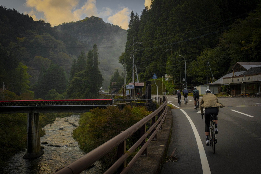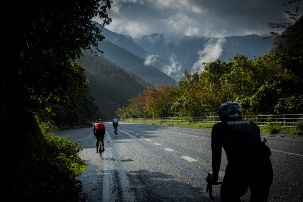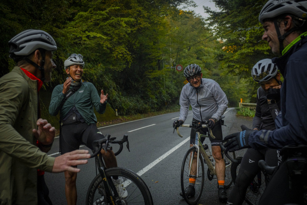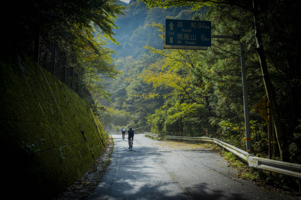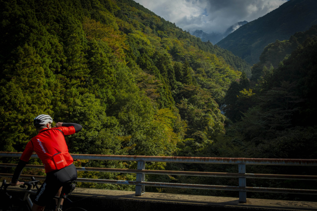 ライド2日目は、愛媛の山へと向かう。目指すは屈指の山岳サイクリングルート、”UFOライン”。西日本最高峰の石槌山系を巡る絶景ルートだ。しかし、海に面した西条市内の海抜ほぼ0mから、一気に1700mの高地へ駆け上がるのだから、気合が入る。朝まで降っていた雨は上がり、雲間から朝日が差してくる。清々しい空気の中、渓谷沿いに徐々に狭まる長い登坂を、脚の合う者同志でパックになって登ってゆく。樹林帯の九十九折の道の、程よい勾配を行けば、背の高い、まっすぐな杉の木立の間をすり抜けた光が、キラキラと遊ぶ。見え隠れする稜線が、朝日を受け輝いている。ロブ、アダム、ピーター、マークの4人と、徒然にサドルトークを交わし、気心も知れてくる。紅葉の斜面を、昨日の雨水を束ねた清冽な滝筋が、谷底へと落ちていく。不意に訪れるシャッターチャンスが悩ましい。皆スマホを構えて行きつ戻りつ、せわしいクライミングを経て、ようやくUFOラインの入口に取り付いた。気づけば標高は1000mを越えていた。コーヒーに特に目がないオージーたちのために、ガイドのサムさんとミホさんが淹れてくれたコーヒーとスイーツが嬉しい。四国山脈に抱かれ、至福の珈琲タイムに和む。