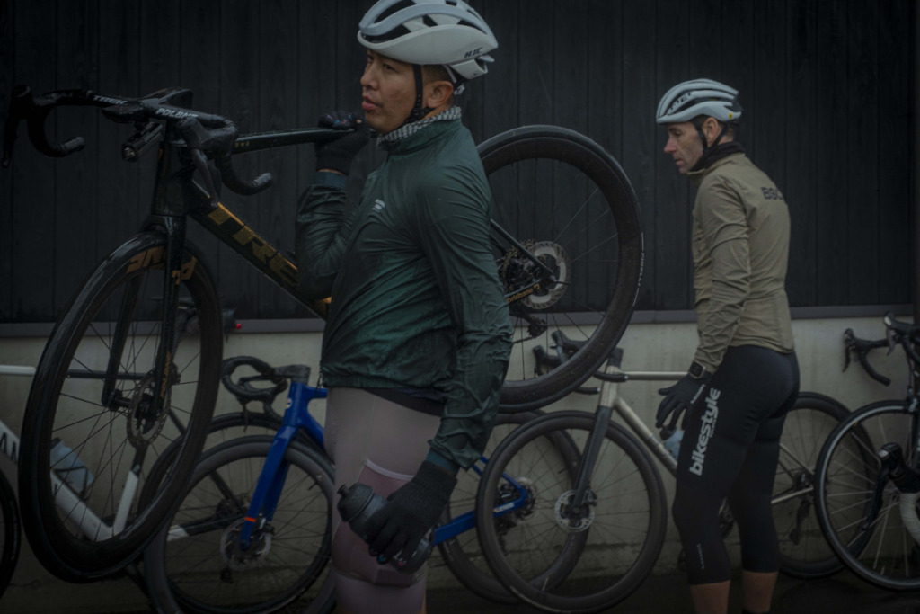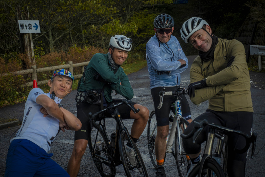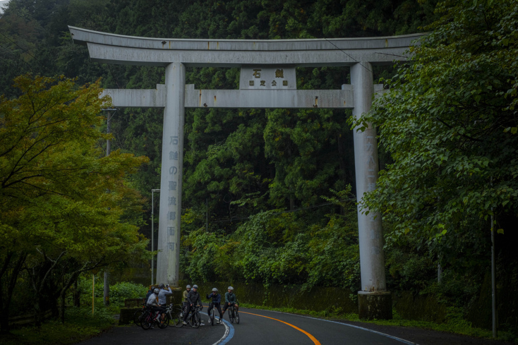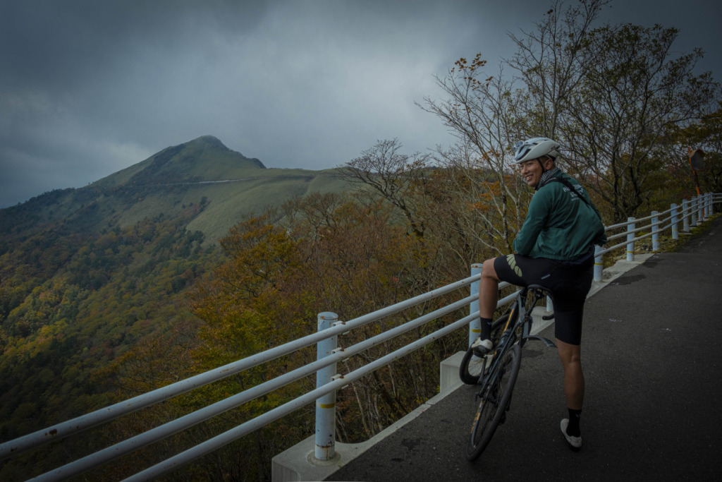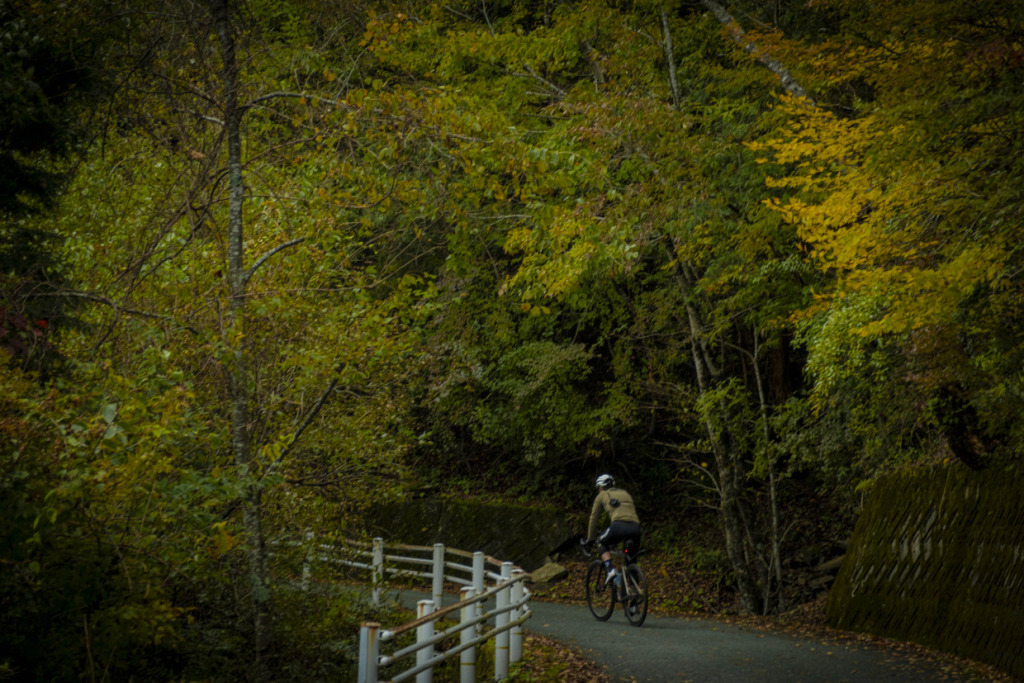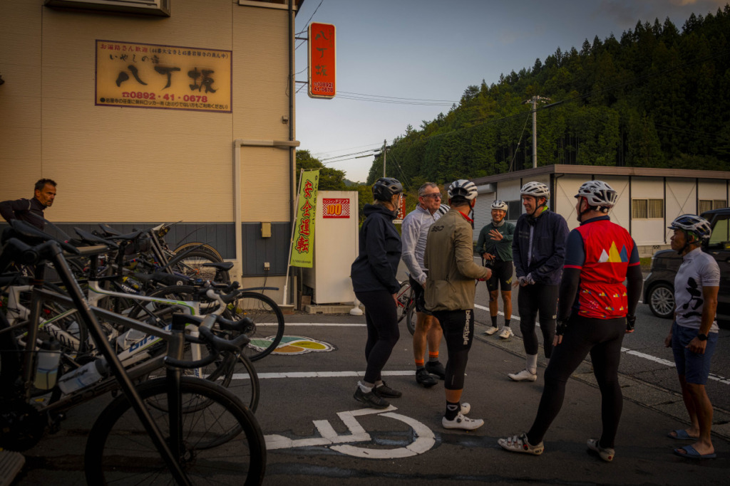 ライド2日目は、愛媛の山へと向かう。目指すは屈指の山岳サイクリングルート、”UFOライン”。西日本最高峰の石槌山系を巡る絶景ルートだ。しかし、海に面した西条市内の海抜ほぼ0mから、一気に1700mの高地へ駆け上がるのだから、気合が入る。朝まで降っていた雨は上がり、雲間から朝日が差してくる。清々しい空気の中、渓谷沿いに徐々に狭まる長い登坂を、脚の合う者同志でパックになって登ってゆく。樹林帯の九十九折の道の、程よい勾配を行けば、背の高い、まっすぐな杉の木立の間をすり抜けた光が、キラキラと遊ぶ。見え隠れする稜線が、朝日を受け輝いている。ロブ、アダム、ピーター、マークの4人と、徒然にサドルトークを交わし、気心も知れてくる。紅葉の斜面を、昨日の雨水を束ねた清冽な滝筋が、谷底へと落ちていく。不意に訪れるシャッターチャンスが悩ましい。皆スマホを構えて行きつ戻りつ、せわしいクライミングを経て、ようやくUFOラインの入口に取り付いた。気づけば標高は1000mを越えていた。コーヒーに特に目がないオージーたちのために、ガイドのサムさんとミホさんが淹れてくれたコーヒーとスイーツが嬉しい。四国山脈に抱かれ、至福の珈琲タイムに和む。