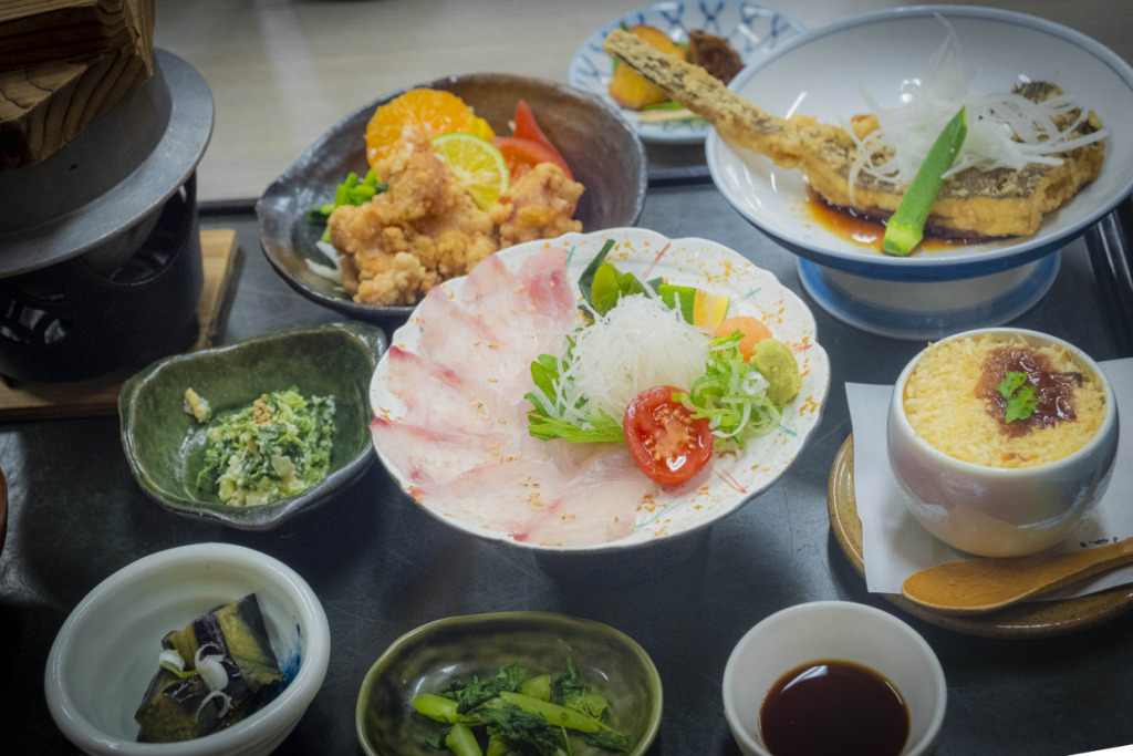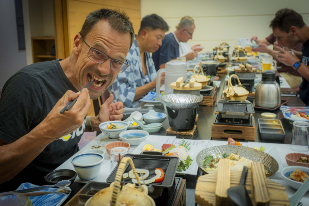 無事、雨と霧と陽光入り混じるUFOラインを越えた一行は、魅惑の天上界に別れを惜しみ、下山の途についた。難敵の“UFO”を協力してやっつけたせいか、組み直したトレインは安定感が違うから面白い。お互いアイコンタクトで感じ取ることができる。言葉に頼らずとも、意思疎通を育むサイクリングの効能だろう。面河渓谷はじめ、石槌山の南麓に広がる明媚なる渓谷地帯を駆け降り、爽快なダウンヒルルートを楽しんで、この日の終着地久万高原に到着した。四国最大のクライミングを含んだ100kmライドこなし、みなやりきった充実の表情だが、その代償に、大の大人たちも腹ペコだ。この日の宿泊する純日本的民宿、八丁坂さんのアットホームな畳の宴会場で、郷土色豊かな山海の幸を囲み、ライドの感想戦に花が咲いた。