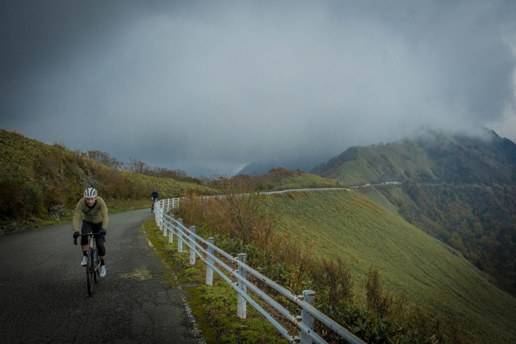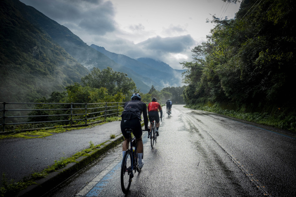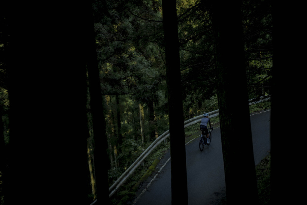 急に、尾根を渡る冷たい風が吹き抜ける。突如目の前が白く閉ざされると、どうやら雲に巻かれたらしい。少し先を走る仲間の背中も見えなくなるほど濃い霧があたりを覆う。上も下もない真っ白な世界は、UFOラインの名にふさわしい神秘のムードだ。雲に巻かれ、冷たい雨に打たれ、ゼエハア言わせて山の中を彷徨う自転車の一団は、はたから見たら気の毒そのものだろうな、と思うが、実際は、皆幸せの絶頂にいるおかしさだ。それこそ神秘だろう。石鎚山で修行したという伝説の修験者役行者、はたまた弘法大師の呪法がバッチリ効いたか、異国よりの来訪者は、明らかにこの山の虜囚となっている。苦楽が入り混じるサイクリストならではのイイ横顔を、必死で追ってシャッターを切る。
