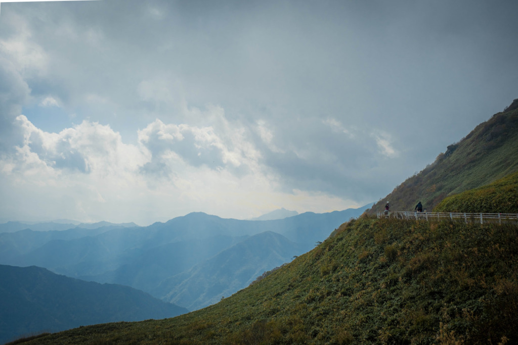 カフェインを摂取したら、いよいよUFOラインに突入。ここからまだ700mほど登る。寒風山や伊予富士、瓶ヶ森といった石鎚山系の名峰をトラバースしながらのアップダウンで高度を上げていく。遅い紅葉もいよいよ色づく。崖を荒々しく穿ったな隧道や切り通しをいくつも抜ける。やがて木々はまばらに、樹高も低くなる。森林限界を自力で越えていくのは、格別の感がある。視界が開け、見晴らす四国山陵の遠景には、非の打ちようもない。尾根が間近に近づくと、勾配は緩んで熊笹の繁る草原の一本道となった。道の先では、自念子ノ頭、1701mの頂を天に向けている。UFOラインで最もシンボリックな稜線が、絶景かな!